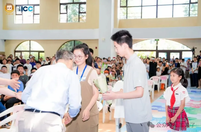 88 岁的沈学础院士与上海民办平和中学吴金轩,上海外国语大学浦东外国语学校陈圣朵,上海北郊学校袁韩梓和宇树科技机器人等共同点亮水晶球的瞬间,成为赛事启动仪式的高光时刻。孩子们向院士献上恒源祥非遗技艺制作的绒线玫瑰,象征科技与人文的代际传承;宇树科技的机器人作为特殊嘉宾参与仪式,科技感与童趣在此碰撞。