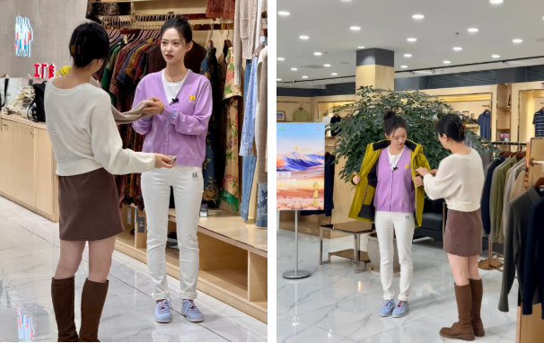 在充满云南地域特色的彩羊昆明旗舰店内,陈雨锶沉浸式感受了品牌对面料与品质的极致追求。当工作人员详细介绍了店内主推的采用顶级羊毛、羊绒织就的经典服饰时,陈雨锶不禁动情地表示,这熟悉的触感让她瞬间回忆起在厦门参加“星辰大海”青年演员训练营的珍贵时光,正是这样一件舒适的羊毛衫,带给了她温暖的慰藉。随后,她又被一件件充满蕴含东方韵味的服饰所吸引,工作人员介绍这是具有深厚文化底蕴的非物质文化遗产香云纱,它经过特殊薯莨浸染与河泥覆盖处理,呈现出独特的光泽与肌理,完美诠释了传统工艺与现代时尚的融合共生。