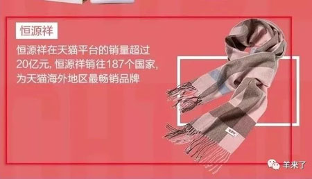 由阿里巴巴集团公共事务部依据各经典品牌在天猫、淘宝平台上(时间范围:2017年8月至2018年7月)的表现,研制出的“天猫国潮老字号焕新记”排名图上,恒源祥表现突出,勇夺三项第一:出海规模排名第一、电商规模排名第一、包装好评榜排名第一;在粉丝数排名中,恒源祥以“561万+”的粉丝规模位居第二。权威数据显示:恒源祥品牌的产品销往187个国家。近年来,恒源祥的国际知名度和国际影响力越来越大,并一直在不断地提升中。