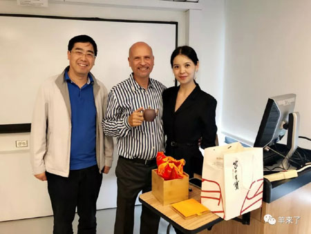 恒源祥家纺产业总经理强建春和集团培训中心副总监罗严为艾伯特•M•罗马诺主任送上来自家中有宝的礼品,他表示非常喜欢来自中国的礼物,希望下次到中国时能到恒源祥参观访问。