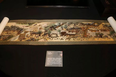 刘瑞旗董事长在展会现场为领导们介绍了这幅被原故宫博物院副院长肖燕翼啧啧称赞的苏绣《清明上河图》。它是以《清明上河图》为题材进行绣制的,以长卷形式呈现,作品宽28厘米、长1040厘米 ,生动立体地重现了清明上河图中记录的中国北宋都城东京的城市面貌和当时社会各阶层人民的生活状况。在10米多长的画卷里,苏绣大师几乎完美还原了画中数量庞大的各色人物,牛、骡、驴等牲畜,车、轿、大小船只,房屋、桥梁、城楼等,具有很高的历史价值和艺术价值。