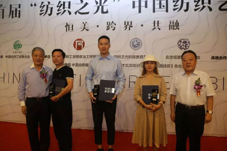 在开幕式的颁奖环节,与会领导为获得首届“纺织之光”中国纺织艺术展金奖、银奖、铜奖、优秀奖及评委会特别奖颁发荣誉证书和奖杯。恒源祥家纺“百子百羊被”喜获银奖,恒源祥家纺产业总经理助理孙蕴聪上台领奖。
