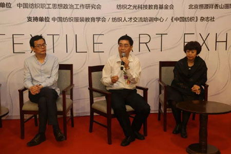首届“纺织之光•中国纺织艺术展”作为一项长期性、行业性、学术性和公益性展览活动,是由中国纺织工业联合会作为指导单位,由中国纺织职工思想政治工作研究会、纺织之光科技教育基金会、北京恒源祥香山画院联合主办,中国纺织服装教育学会、纺织人才交流培训中心、《中国纺织》杂志社作为支持单位,为保证展览的质量和学术水平,特邀中央美术学院、清华大学美术学院、香港理工大学、北京服装学院、意大利佩鲁贾美术学院等近100多家艺术院校及机构作为学术支持单位。本次展览得到了中央国家机关、部委、北京市有关单位和机构领导和各界人士的大力支持。精彩的展会自9月3日开幕将持续到9月8日。