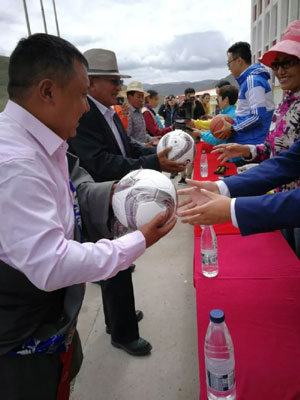 项目组向学校赠送篮球、排球、羽毛球拍等文体用品。