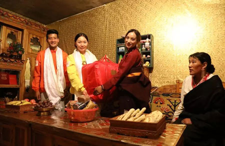 刘静茹代表项目组还前往巴毛拉忠老师的家,关心老师的平时生活,并赠送巴毛拉忠老师一床恒源祥羊毛被。