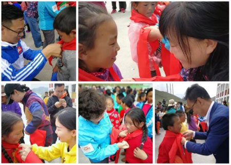 领导、项目组代表与老师们一起为孩子们戴上鲜艳的红领巾,叮嘱他们要好好学习,长大后做个对社会有用的人。