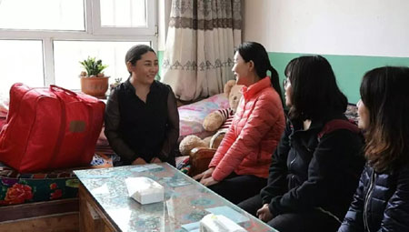 学校活动结束后,项目组一行还特意前往久雅老师的家里慰问,关心老师平时的生活,并送上一床恒源祥羊毛被。