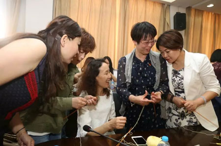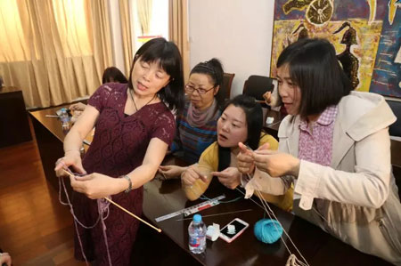 来自于淞浦中学的王晓红老师是位有名的编织达人,活动中,王老师耐心地教授编织技艺。