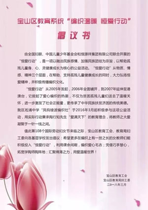 2018年,在春风拂面的三月,宝山区教育系统发出了《编织温暖 恒爱行动》倡议书,发动教师们用实际行动秉承陶行知先生“爱满天下”的教育理念,将教师之大爱凝聚于一针一线之间,汇聚绵薄之力,用爱温暖世界!