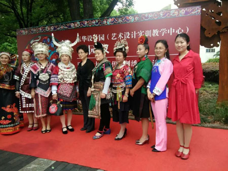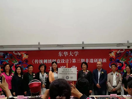 2018年5月8日,李蔷老师应邀参加东华大学第三期《传统刺绣创意设计》非遗研修班开学典礼,本期研修班共有来自上海地区的2位学员和贵州的18位学员,研修班将用24天完成192学时的培训。课程由政策法规、基础课程、拓展课程、参观课程、结对创作及制作实践六部分组成,将帮助非遗传承人群强基础、拓眼界、增学养,增强文化自信,提高专业技术能力和可持续发展能力。