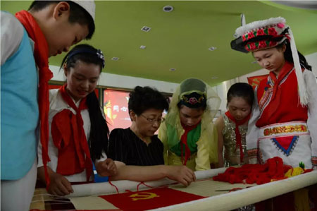在2017年6月开展的“同心向党 共绣红旗”系列活动中,李蔷老师手把手教回民小学的学生绒绣针法,让学生们体验海派绒绣的魅力