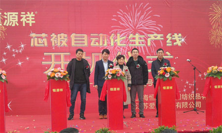 2018年,恒源祥家纺有限公司迎来成立20周年,恒源祥家纺三厂江苏爱伦家纺有限公司成立25周年,为了更好地满足消费者日益增长的需求,3月18日,恒源祥家纺三厂斥巨资打造的芯被自动生产线开机仪式于当日上午10:58分准时开始,恒源祥集团副总经理康强,恒源祥家纺总经理强建春,恒源祥家纺三厂负责人符惠琴等领导出席开机仪式,并参观新生产线。随着新生产线的正式开机,为恒源祥家纺在未来的发展奠定了坚实基础。