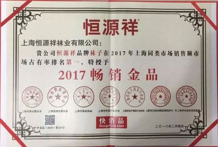恒源祥品牌袜子、内衣在两个品类的度线上/下榜单中均位居前列,分别为2017年上海同类市场销售额市场占有率排名第一、第三位,鉴于二者具有较高的市场占有率,并结合消费者的认知度、美誉度、满意度调研结果,主办方特授予恒源祥品牌袜子、内衣“2017畅销金品奖”。集团商超产业总经理助理潘振华应邀出席活动并代表集团上台领奖。