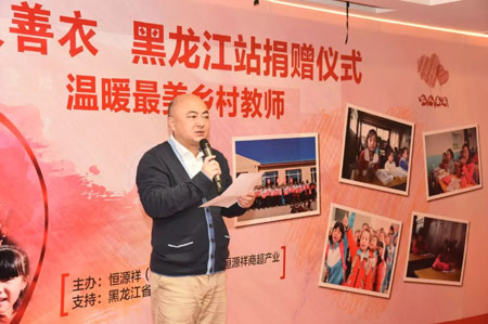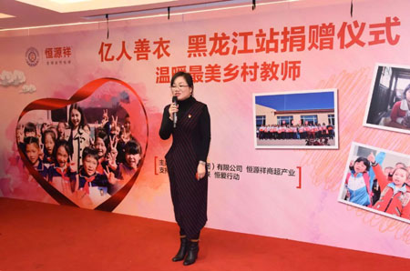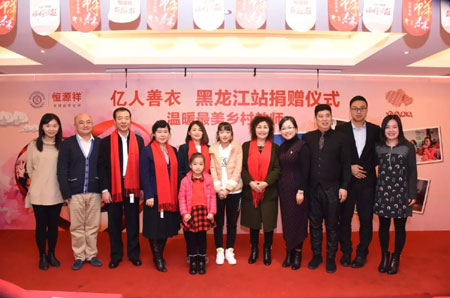 1月19日,“亿人善衣——温暖最美乡村教师”黑龙江站捐赠仪式在恒源祥集团八楼举行。黑龙江省妇联副主席白锦婵、妇儿基会秘书长李晓明、恒源祥集团党委副书记顾红蕾、集团公益慈善中心副总监张星磊、恒源祥商超产业公司总经理穆震涛、恒源祥黑龙江地区经销商赵长海以及来自黑龙江地区的老师和学生代表等出席了本次活动。