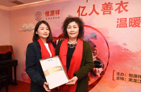 商超产业穆震涛总经理代表“亿人善衣”项目组向黑龙江省妇联赠送400套高端羊毛内衣。