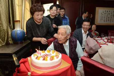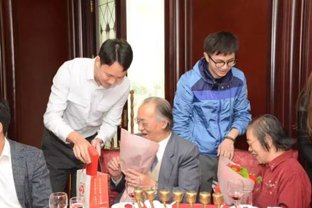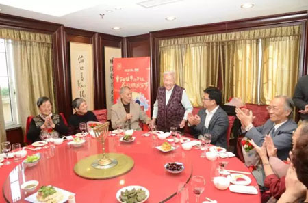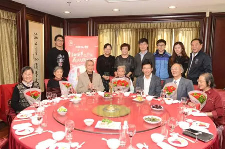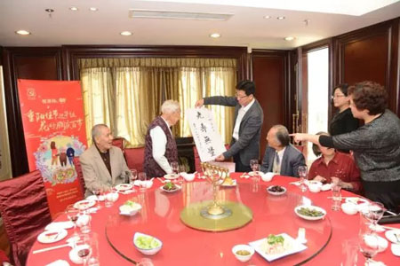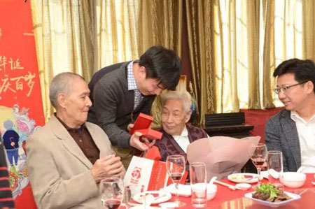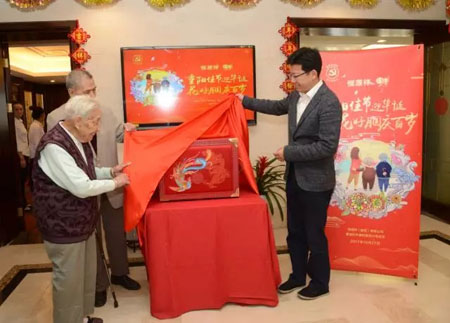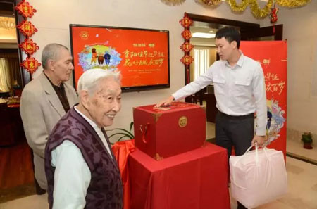 黄浦区人大代表、恒源祥集团总经理陈忠伟为百岁老人张凤英准备了一份特殊的礼物——“恒好百年”品牌的龙凤呈祥箱和羊毛被,祝福老人百岁生日快乐,健康长寿。