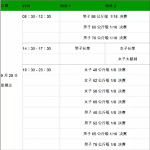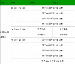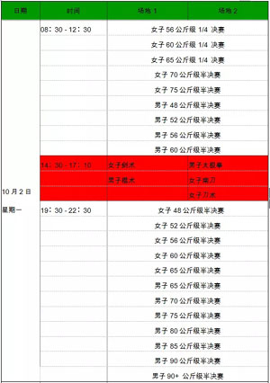 散打比赛除了上午进行女子56、 60、 65 公斤级1/4决赛外,散打半决赛将在该日陆续上演。套路将在下午进行女子剑术、南刀、刀术,男子太极拳、棍术5个项目的比赛。
