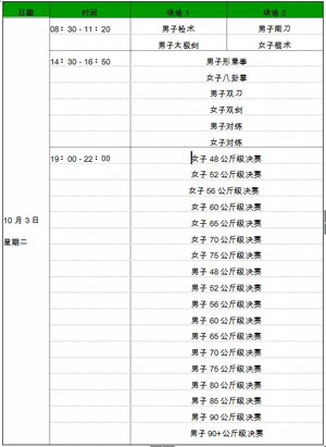 最后一个比赛日,可谓精彩纷呈,武术套路将在10月3日白天进行男子枪术、南刀、太极剑、形意拳、双刀、对练,女子棍术、八卦掌、双剑、对练比赛,共将产生10块金牌。武术散打比赛决赛将于晚7点(莫斯科时间)拉开帷幕,先后进行女子散打48、52、56、60、 65 、70、75公斤级,男子散打 48、52、56、60、 65 、70、75、80、85、90、90+ 公斤级决赛。