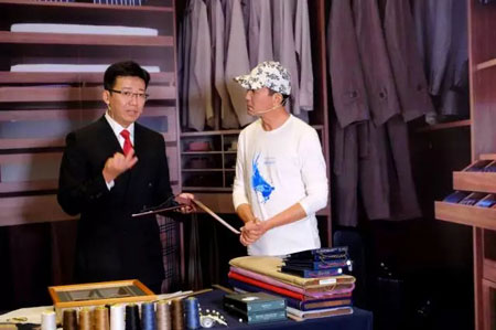 “羊毛专家果真是名不虚传!”陈忠伟总经理为吴刚老师介绍身上穿的一套特别的西装,原来这套西装是由世界上最细羊毛制成。2004年,恒源祥以600万人民币在澳大利亚竞拍的90公斤顶级世界最细羊毛,又称金羊毛,细度仅为11.9微米。陈总还介绍了恒源祥与英国著名萨维尔街关于定制的合作意向。