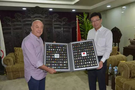 图:陈忠伟总经理代表恒源祥赠送阿拉库主席奥运徽章