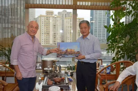 恒源祥集团董事长刘瑞旗、总经理陈忠伟、副总经理李巍等热情接待了来访的嘉宾一行,陪同嘉宾参观了恒源祥文化艺术展厅,观看了《恒源祥与体育》纪录片等。刘瑞旗董事长和陈忠伟总经理向阿拉库主席一行介绍了恒源祥与体育事业的渊源,与奥林匹克的缘分,以及关于武术项目的开展情况。
