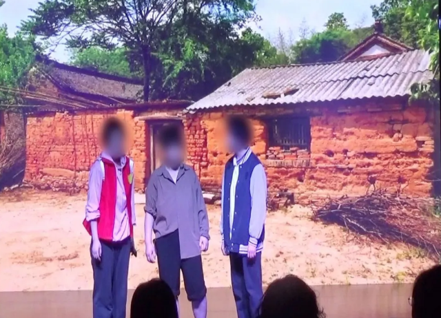 穿“大白熊毛衣”的青海女孩(中)在“恒爱行动”启动仪式上发言