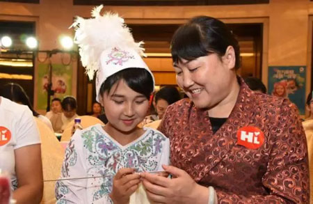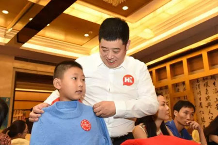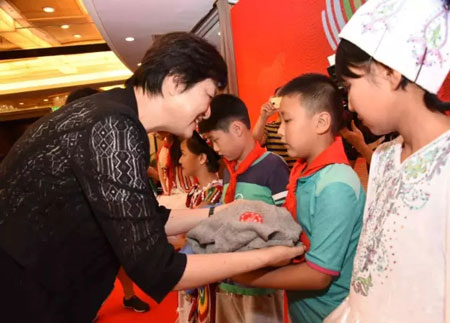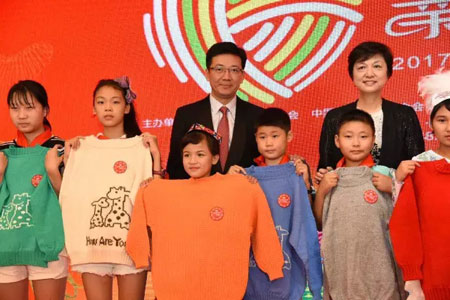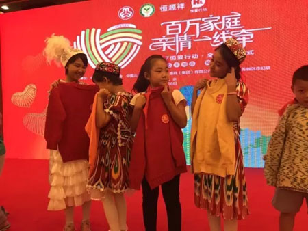 邓丽副主席、朱锡生秘书长、陈忠伟总经理为内地和新疆受助儿童代表赠送爱心毛衣。