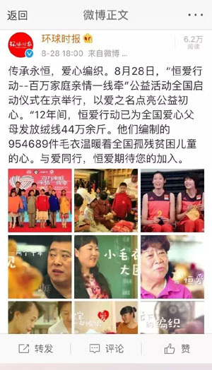 在过去的一年里,“恒爱”凝聚了更多的社会力量,有民间NGO组织和95后的大学生群体,同时也有中国女排队员的参与和支持等。在社会各界的大力参与和支持下,2018年,“恒爱行动”将以第一百万件毛衣诞生为新起点,将进一步扩大国际化道路,将结合“一带一路”战略开展更多的民间慈善交流活动。