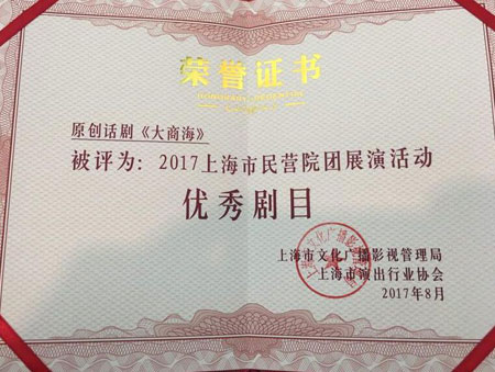 今年5月,由上海市教委、中共上海市黄浦区委宣传部指导,上海恒源祥戏剧发展有限公司出品的原创话剧《大商海》应邀参与“2017上海市民营院团展演活动”,于5月20日和5月21日在上戏剧院精彩上演了两场,好评如潮。近日,上海市文化广播影视管理局和上海市演出行业协会颁给《大商海》“优秀剧目”奖。