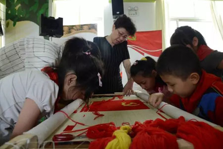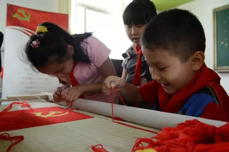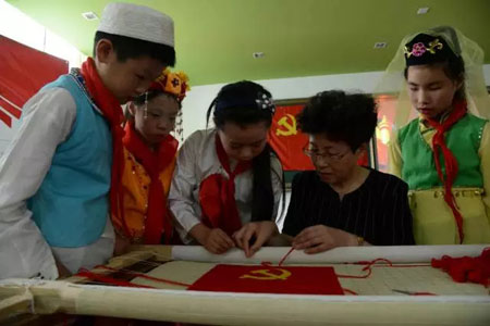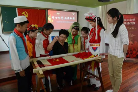 在李蔷老师的指导下,同学们认真地学起绒绣,一针一线地绣着党旗,表达着童心向党之情。