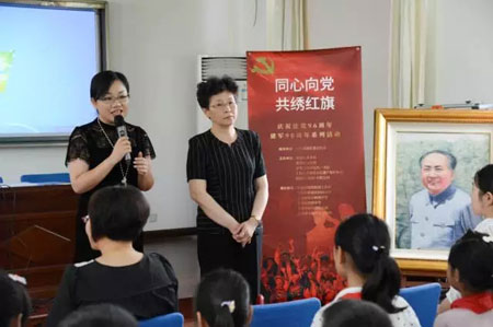 6月16日下午,由恒源祥集团党委副书记顾红蕾带队,恒源祥绒绣原创工作室首席工艺师李蔷、工艺师陶鸿国和马俊,集团党团员志愿者一行来到黄浦区回民小学,开展以国家级非遗项目“海派绒绣”技艺共绣党旗的“同心向党 共绣红旗”走进校园第四站活动。