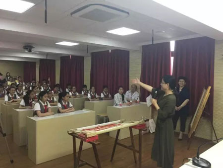 活动中,顾书记和李蔷老师为预备班同学们上了一堂特别的非遗文化课,用视频和现场讲解作品的方式向同学们介绍了海派绒绣技艺。