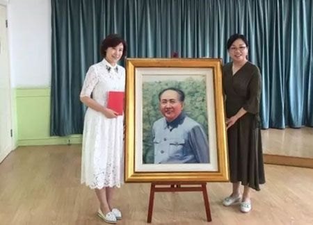 顾书记与上海好小囡幼儿园黄颖岚园长在绒绣作品前合影留念