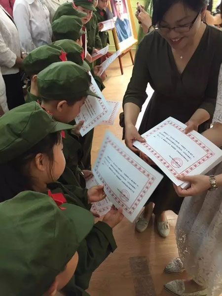 顾书记为孩子们颁发了参与“同心向党 共绣红旗”活动荣誉证书。