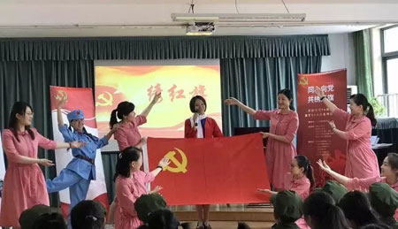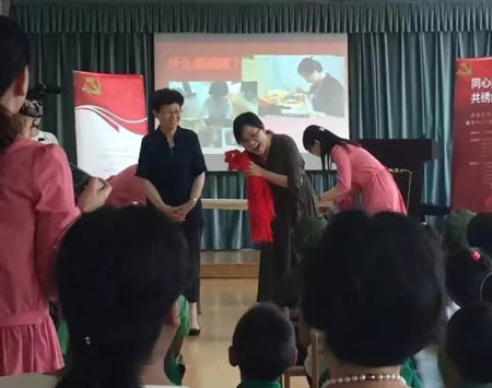 顾书记和绒绣传承人李蔷老师为充满好奇心的孩子们介绍了“海派绒绣”这门技艺;多才多艺的老师们用歌舞表演了《绣红旗》;园长妈妈黄颖岚为孩子们讲述了党旗的故事;孩子们大合唱《闪闪红星》;在李蔷老师的指导下孩子们共绣党旗……好小囡幼儿园三代党支部书记、新老党员、团员青年也齐聚一堂,薪火相传……令此次活动满满都是爱。