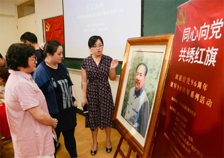 格致中学的老师也对绒绣技艺非常感兴趣,顾书记为老师们作介绍