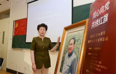 红蕾老师还特意为同学们介绍了“同心向党 共绣红旗”系列活动开展的背景、意义及进展情况,在了解到活动中“共绣”出的这幅党旗作品的特殊含义后,同学们也积极踊跃地要求参与到活动中。在李蔷老师的亲自指导下,同学们认真地、一针一线地共绣这面党旗,亲身体验了绒绣技艺,感受非遗独特魅力的同时,又是一次爱党爱国行为的践行。