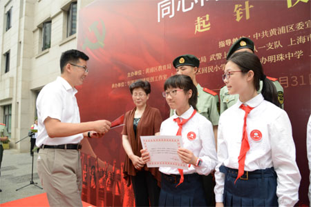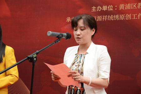 黄浦区教育局局长姚晓红为回民小学木易莎同学颁发了第一针证书;黄浦区文化局党委书记曹跟林,上海市非物质文化遗产保护协会副会长、恒源祥集团总经理陈忠伟等领导为大家颁发了参与“同心向党 共绣红旗”活动荣誉证书。