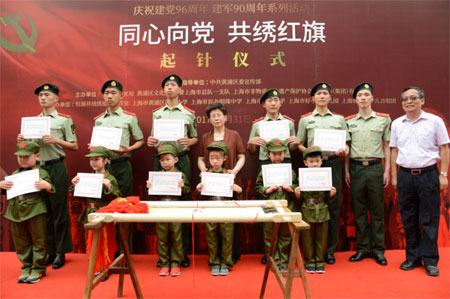 2017年,建党96周年、建军90周年、迎接党的十九大胜利召开之际;上海是一座光荣的城市,其中黄浦区又是党的诞生地、共青团发源地、国歌唱响地、解放上海第一面红旗升起地;以传承非遗技艺“海派绒绣”的方式,武警与好小囡们共同绣制党旗,充分体现了“军民团结一家亲”的亲密情感,表达了广大人民对党的拥护之心和拳拳的爱国之心。