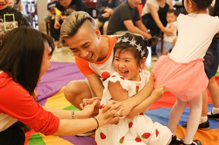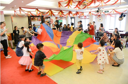在著名童谣“London Bridge is Falling Down”的欢快旋律中,现场的孩子们或是举起双手,或是摇起沙锤,纷纷跟着音乐舞动起来。随后,家长们也加入其中,和孩子们一同玩起“小火车”、“降落伞”等小游戏。现场气氛其乐融融,家长和孩子们的脸上都洋溢着幸福的笑容。
