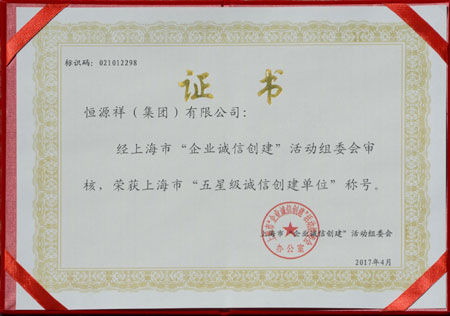 上海市“五星级诚信创建单位”是上海市“企业诚信创建”活动设置的最高荣誉。获得该荣誉代表着已连续4年参与该项评审的恒源祥集团在诚信创建工作中,又迈上了一个新的台阶。