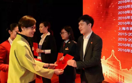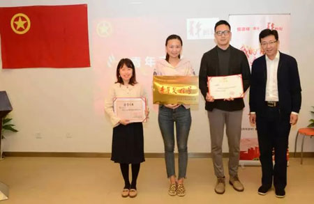 图:黄浦区副区长李原为恒源祥集团团委书记刘帅颁发获奖证书。