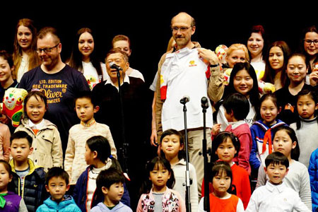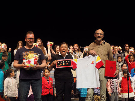 赵家圭团长还赠送了德国拉菲莉亚少女合唱团指挥恒源祥“番茄炒蛋”T恤和奥运徽章。