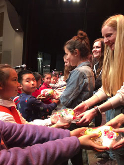 音乐无国界,在演出前的彩排活动中,对音乐的共同热爱让两个合唱团建立起了深厚友谊。好小囡少儿合唱团团长赵家圭赠送德国拉菲莉亚少女合唱团指挥一只大彩羊,而小朋友们把一只只可爱的小彩羊赠送给了少女合唱团天使般的大姐姐们。