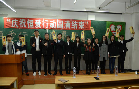 在哈尔滨商业大学,共有120多名大学生通过校团委和学校公益社团的号召组织开展爱心编织活动,包括人员组织、毛线发放、编织作品回收、编织作品上交省妇联,全部由学生自己完成,现场也举行了一个小型的典礼,庆祝哈尔滨商业大学“恒爱行动”圆满结束。