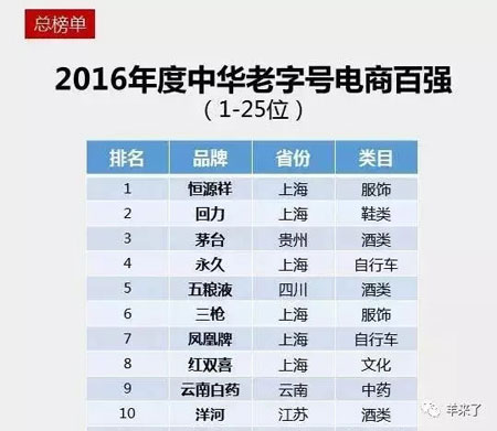 根据对2016年度全国老字号品牌在阿里零售平台销售额的统计,恒源祥、回力和茅台名列老字号电商排行榜的前三甲。其他入围前十位的还包括永久、五粮液、三枪、凤凰、红双喜、云南白药和洋河。