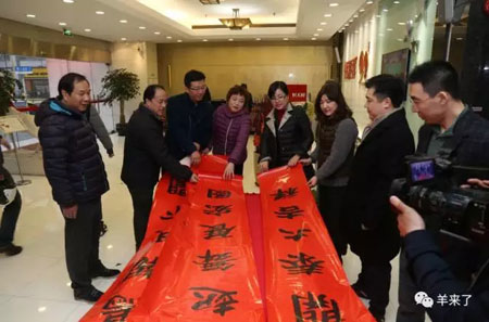“三阳开泰恒源祥 金鸡报晓天下闻”,周先生介绍这幅对联的含义是冬去春来,喜贺恒源祥90周年,祝恒源祥在金鸡年生意兴隆,品牌越做越大,名气越来越响。“三阳开泰” 寓意美好,勃勃生机,吉祥之兆;其中“三阳”同“三羊”又暗含“恒源祥”之意。