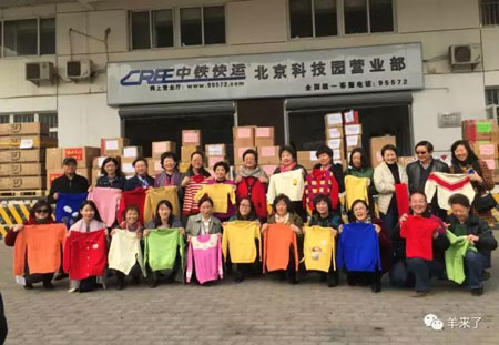 图:中直机关的爱心妈妈们在衣服启运前共同展示她们编织的爱心毛衣