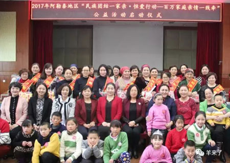 1月24日下午,新疆阿勒泰地区妇联举办2017年“民族团结一家亲•恒爱行动——百万家庭亲情一线牵”公益活动启动仪式,再次组织机关妇委会的干部职工和社会各界爱心人士为孤残、贫困儿童编织爱心毛衣,并将中央机构编制委员会办公室,吉林省、重庆市爱心妈妈亲手编织的1500件毛衣送到阿勒泰各族儿童手中。