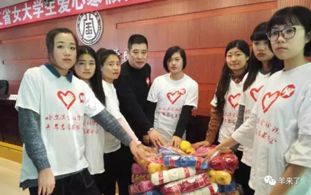 图:黑龙江积极领取毛线的大学生们